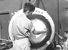 The first thing he had to do was determine the characteristics of the aircraft that would be used. There were only two Allied aircraft large enough: the British Avro Lancaster and the US Boeing B-29 Superfortress.[15] The United States Army Air Forces (USAAF) wanted to use the B-29 if at all possible, even though it required substantial modification.[16] Ramsey supervised the test drop program, which began at Dahlgren, Virginia, in August 1943, before moving to Muroc Dry Lake, California, in March 1944. Mock-ups of Thin Man and Fat Man bombs were dropped and tracked by an SCR-584 ground-based radar set of the kind that Ramsey had helped develop at the Radiation laboratory. Numerous problems were discovered with the bombs and the aircraft modifications, and corrected.[17]