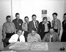 At Los Alamos, Bradbury became head of E-5, the Implosion Experimentation Group,[15] which put him in charge of the implosion field test program.[16] In August, the laboratory's director, Robert Oppenheimer, implemented a sweeping reorganisation. E-5 became part of George Kistiakowsky's new Explosives Division (X Division), and was renumbered X-1.[17] At this point, Bradbury was leading some of the most critical work at the laboratory, as it struggled with the jets that spoiled the perfect spherical shape desired for the implosion process. These were examined with a combination of magnetic, X-ray and RaLa techniques.[18]