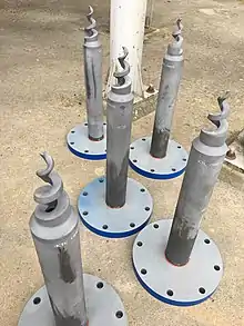 Multiple large spiral nozzles (also known as pigtail nozzles) used in a scrubber application. Spiral nozzles typically have the largest free passage design to help prevent clogging.