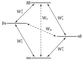 In the simplest case where the NOE is relevant, the resonances of two spin-1⁄2 nuclei, I and S, are chemically shifted but not J-coupled. The energy diagram for such a system has four energy levels that depend on the spin-states of I and S corresponding to αα, αβ, βα, and ββ, respectively. The W's are the probabilities per unit time that a transition will occur between the four energy levels, or in other terms the rate at which the corresponding spin flips occur. There are two single quantum transitions, W1I, corresponding to αα ➞ βα and αβ ➞ ββ; W1S, corresponding to αα ➞ αβ and βα ➞ ββ; a zero quantum transition, W0, corresponding to βα ➞ αβ, and a double quantum transition corresponding to αα ➞ ββ.