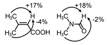 The NOE developed from the theoretical work of American physicist Albert Overhauser who in 1953 proposed that nuclear spin polarization could be enhanced by the microwave irradiation of the conduction electrons in certain metals.[5] The electron-nuclear enhancement predicted by Overhauser was experimentally demonstrated in 7Li metal by T. R. Carver and C. P. Slichter also in 1953.[6] A general theoretical basis and experimental observation of an Overhauser effect involving only nuclear spins in the HF molecule was published by Ionel Solomon in 1955.[7] Another early experimental observation of the NOE was used by Kaiser in 1963 to show how the NOE may be used to determine the relative signs of scalar coupling constants, and to assign spectral lines in NMR spectra to transitions between energy levels. In this study, the resonance of one population of protons (1H) in an organic molecule was enhanced when a second distinct population of protons in the same organic molecule was saturated by RF irradiation.[8] The application of the NOE was used by Anet and Bourn in 1965 to confirm the assignments of the NMR resonances for β,β-dimethylacrylic acid and dimethyl formamide, thereby showing that conformation and configuration information about organic molecules in solution can be obtained.[9] Bell and Saunders reported direct correlation between NOE enhancements and internuclear distances in 1970[10] while quantitative measurements of internuclear distances in molecules with three or more spins was reported by Schirmer et al.[11]