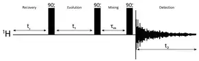 The basic NOESY sequence consists of three 90° pulses. The first pulse creates transverse spin magnetization. The spins precess during the evolution time t1, which is incremented during the course of the 2D experiment. The second pulse produces longitudinal magnetization equal to the transverse magnetization component orthogonal to the pulse direction. Thus, the idea is to produce an initial condition for the mixing period τm. During the NOE mixing time, magnetization transfer via cross-relaxation can take place. For the basic NOESY experiment, τm is kept constant throughout the 2D experiment, but chosen for the optimum cross-relaxation rate and build-up of the NOE. The third pulse creates transverse magnetization from the remaining longitudinal magnetization. Data acquisition begins immediately following the third pulse and the transverse magnetization is observed as a function of the pulse delay time t2. The NOESY spectrum is generated by a 2D Fourier transform with respect to t1 and t2. A series of experiments are carried out with increasing mixing times, and the increase in NOE enhancement is followed. The closest protons show the most rapid build-up rates of the NOE.