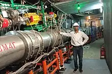 Nuclotron is a superconductive synchrotron, exploited by the Joint Institute for Nuclear Research in Dubna, Russia.[1] This particle accelerator is based on a miniature iron-shaped field superconductive magnets, and has a particle energy up to 7 GeV. It was built in 1987–1992 as a part of Dubna synchrophasotron modernisation program (the Nuclotron ring follows the outer perimeter of the superconductive booster synchrotron ring). Five runs of about 1400 hours total duration have been provided by the present time. The most important experiments tested the cryomagnetic system of a novel type, and obtained data on nuclear collisions using internal target.