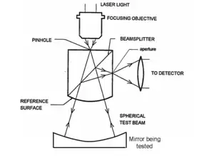 A null corrector is an optical device used in the testing of large aspheric mirrors. A spherical mirror of any size can be tested relatively easily using standard optical components such as laser, mirrors, beamsplitters, and converging lenses. One method of doing this using a Shack cube is shown at the right, and many other setups are possible. An interferometer test such as this one generates a contour map of the deviation of the surface from a perfect sphere, with the contours in units of half the wavelength used. This is called a null test because when the mirror is perfect, the result is null (no contours at all). If the result is not null, then the mirror is not perfect, and the pattern shows where the optician should polish the mirror to improve it.