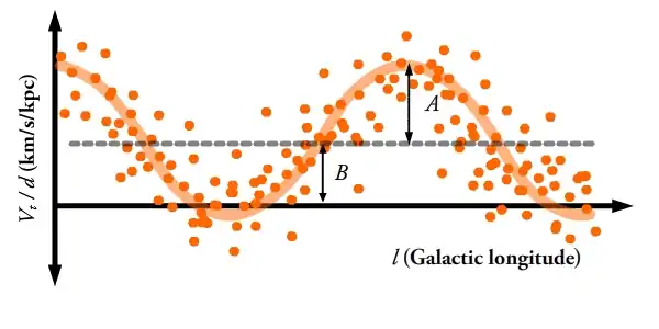 Since the non-circular component of the Sun's velocity is known, it can be subtracted out from our observations to compensate. We do not know, however, the non-circular components of the velocity of each individual star we observe, so they cannot be compensated for in this way. But, if we plot transverse velocity divided by distance against galactic longitude for a large sample of stars, we know from the equations above that they will follow a sine function. The non-circular velocities will introduce scatter around this line, but with a large enough sample the true function can be fit for and the values of the Oort constants measured, as shown in figure 2. is simply the amplitude of the sinusoid and is the vertical offset from zero. Measuring transverse velocities and distances accurately and without biases remains challenging, though, and sets of derived values for and frequently disagree.