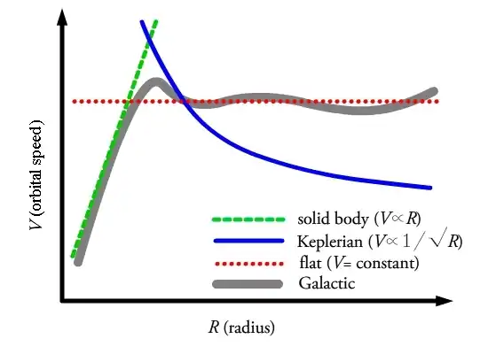 To begin, let one assume that the rotation of the Milky Way can be described by solid body rotation, as shown by the green curve in Figure 3. Solid body rotation assumes that the entire system is moving as a rigid body with no differential rotation. This results in a constant angular velocity, , which is independent of . Following this we can see that velocity scales linearly with , , thus