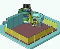 The Argentine company INVAP was fully responsible through a turnkey contract, signed in June 2000, for the delivery of the reactor, performing the design, construction and commissioning. Local civil construction was performed by INVAP's partner, John Holland-Evans Deakin Industries.[1] The facility features a large (20-litre (4.4 imp gal; 5.3 US gal)) liquid-deuterium cold neutron source,[2] modern supermirror guides, and a 35 by 65 metres (115 ft × 213 ft) guide hall. The cold source was designed by the Petersburg Nuclear Physics Institute,[3] the cryogenic system designed and supplied by Air Liquide and the initial set of four supermirror guides supplied by Mirrotron.[4]