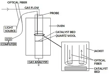 Operando instruments (in situ cells) must ideally allow for spectroscopic measurement under optimal reaction conditions.[8] Most industrial catalysis reactions require excessive pressure and temperature conditions which subsequently degrades the quality of the spectra by lowering the resolution of signals. Currently many complications of this technique arise due to the reaction parameters and the cell design. The catalyst may interact with the components of the operando apparatus; open space in the cell can have an effect on the absorption spectra, and the presence of spectator species in the reaction may complicate analysis of the spectra. Continuing development of operando reaction-cell design is in line with working towards minimizing the need for compromise between optimal catalysis conditions and spectroscopy.[9][10] These reactors must handle specific temperature and pressure requirements while still providing access for spectrometry.