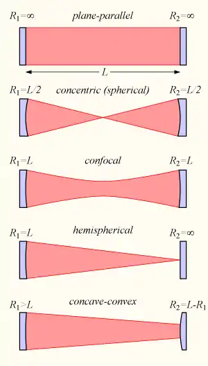 For a resonator with two mirrors with radii of curvature R1 and R2, there are a number of common cavity configurations. If the two radii are equal to half the cavity length (R1 = R2 = L / 2), a concentric or spherical resonator results. This type of cavity produces a diffraction-limited beam waist in the centre of the cavity, with large beam diameters at the mirrors, filling the whole mirror aperture. Similar to this is the hemispherical cavity, with one plane mirror and one mirror of radius equal to the cavity length.
