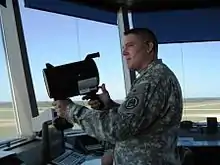 An air traffic controller holding a signal light gun that can be used to direct aircraft experiencing a radio failure (2007).
