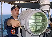 A naval signal lamp, a form of optical communication that uses shutters and is typically employed with Morse code (2002)