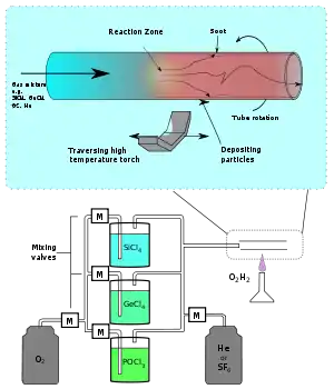 Charles K. Kao and George A. Hockham of the British company Standard Telephones and Cables (STC) were the first to promote the idea that the attenuation in optical fibers could be reduced below 20 decibels per kilometer (dB/km), making fibers a practical communication medium, in 1965.[26] They proposed that the attenuation in fibers available at the time was caused by impurities that could be removed, rather than by fundamental physical effects such as scattering. They correctly and systematically theorized the light-loss properties for optical fiber and pointed out the right material to use for such fibers—silica glass with high purity. This discovery earned Kao the Nobel Prize in Physics in 2009.[27] The crucial attenuation limit of 20 dB/km was first achieved in 1970 by researchers Robert D. Maurer, Donald Keck, Peter C. Schultz, and Frank Zimar working for American glass maker Corning Glass Works.[28] They demonstrated a fiber with 17 dB/km attenuation by doping silica glass with titanium. A few years later they produced a fiber with only 4 dB/km attenuation using germanium dioxide as the core dopant. In 1981, General Electric produced fused quartz ingots that could be drawn into strands 25 miles (40 km) long.[29]