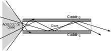An optical fiber is a cylindrical dielectric waveguide (nonconducting waveguide) that transmits light along its axis through the process of total internal reflection. The fiber consists of a core surrounded by a cladding layer, both of which are made of dielectric materials.[58] To confine the optical signal in the core, the refractive index of the core must be greater than that of the cladding. The boundary between the core and cladding may either be abrupt, in step-index fiber, or gradual, in graded-index fiber. Light can be fed into optical fibers using lasers or LEDs.