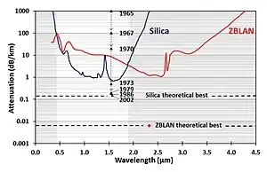 Experimental attenuation curve of low loss multimode silica and ZBLAN fiber. Black triangle points and gray arrows illustrate a four order of magnitude reduction in the attenuation of silica optical fibers over four decades from ~1000 dB/km in 1965 to ~0.17 dB/km in 2005.