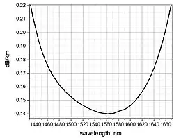 Experimentally measured spectral attenuation of silica core optical fiber.[60] Minimum attenuation is 0.1400 dB/km at 1560 nm wavelength.