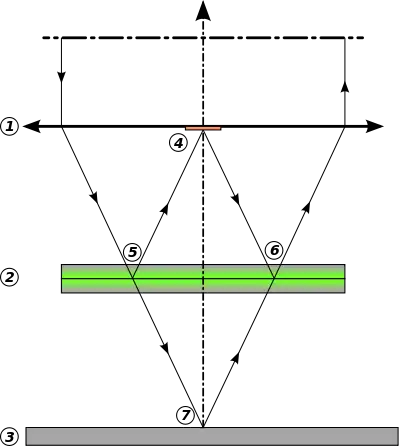 The figure shows the optical path of a Mirau-objective respectively a Mirau-interferometer. Reference beam (4 to 6) and object beam (7) have identical optical path length and can thus cause white light interference.
