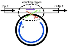 One more feature about optical coupling is the critical coupling. The critical coupling shows that no light is passing through the waveguide after the light beam is coupled into the optical ring resonator. The light will be stored and lost inside the resonator thereafter. [2] Lossless coupling is when no light is transmitted all the way through the input waveguide to its own output; instead, all of the light is coupled into the ring waveguide (such as what is depicted in the image at the top of this page).[3] For lossless coupling to occur, the following equation must be satisfied: