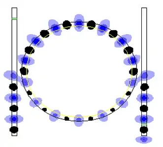 In a double ring resonator, two ring waveguides are used instead of one. They may be arranged in series (as shown on the right) or in parallel. When using two ring waveguides in series, the output of the double ring resonator will be in the same direction as the input (albeit with a lateral shift). When the input light meets the resonance condition of the first ring, it will couple into the ring and travel around inside of it. As subsequent loops around the first ring bring the light to the resonance condition of the second ring, the two rings will be coupled together and the light will be passed into the second ring. By the same method, the light will then eventually be transferred into the bus output waveguide. Therefore, in order to transmit light through a double ring resonator system, we will need to satisfy the resonant condition for both rings as follows: