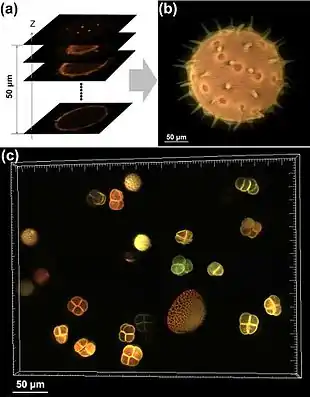 (a) Optically sectioned fluorescence images of a pollen grain. (b) Combined image. (c) Combined image of a group of pollen grains.[1]