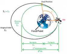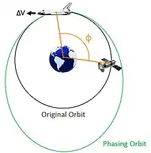 In astrodynamics, orbit phasing is the adjustment of the time-position of spacecraft along its orbit, usually described as adjusting the orbiting spacecraft's true anomaly.[1] Orbital phasing is primarily used in scenarios where a spacecraft in a given orbit must be moved to a different location within the same orbit. The change in position within the orbit is usually defined as the phase angle, ϕ, and is the change in true anomaly required between the spacecraft's current position to the final position.