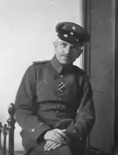 In July 1914—shortly before the outbreak of World War I—Hahn was recalled to active duty with the army in a Landwehr regiment. They marched through Belgium, where the platoon he commanded was armed with captured machine guns. He was awarded the Iron Cross (2nd Class) for his part in the First Battle of Ypres. He was a joyful participant in the Christmas truce of 1914, and was commissioned as a lieutenant.[33] In mid-January 1915, he was summoned to meet chemist Fritz Haber, who explained his plan to break the trench deadlock with chlorine gas. Hahn raised the issue that the Hague Convention banned the use of projectiles containing poison gases, but Haber explained that the French had already initiated chemical warfare with tear gas grenades, and he planned to get around the letter of the convention by releasing gas from cylinders instead of shells.[34]