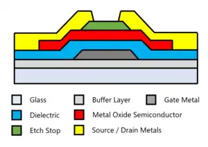 a-Si:H additionally suffers from issues with environmental stability, such as the Staebler-Wronski Effect.[10] As oxides are already oxidized, they are generally more environmentally stable, however they do experience a phenomenon called Negative Bias Illumination Stress (NBIS) where the threshold voltage changes under constant illumination.[11]