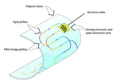 The sensing technology is based around sensing elements called Fiber Bragg Gratings (FBGs) that are fabricated in standard single core silica fibers, highly birefringent Microstructured fibers (MSF) and Plastic optical fibers (POF). The silica MSFs are designed to exhibit almost zero temperature sensitivity to cope with the traditional temperature cross-sensitivity issues of conventional fiber sensors. These specialty fibers are being modeled, designed, and fabricated within the programme. FBGs implemented in plastic optical fiber are also being studied because plastic fibers can be stretched up to 300% before breaking, permitting use under conditions that would result in catastrophic failure of other types of strain sensors.