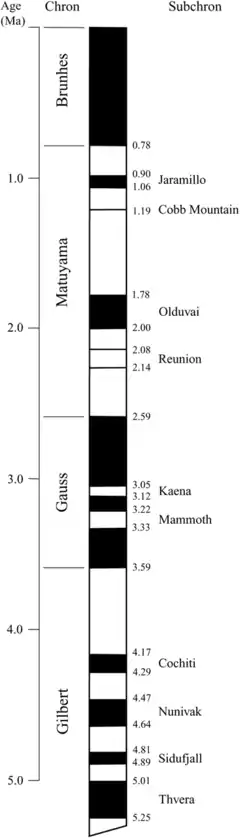Reversal magnetostratigraphy is often used to estimate the age of sites bearing fossils and hominin remains.[17] Conversely, for a fossil of known age, the paleomagnetic data can fix the latitude at which the fossil was laid down. Such a paleolatitude provides information about the geological environment at the time of deposition. Paleomagnetic studies are combined with geochronological methods to determine absolute ages for rocks in which the magnetic record is preserved. For igneous rocks such as basalt, commonly used methods include potassium–argon and argon–argon geochronology.