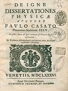 Paolo Casati (in Latin, Paulus Casatus) (23 November 1617 – 22 December 1707) was an Italian Jesuit mathematician. He belonged to the jesuit scientific school founded in the Provincia Veneta by Giuseppe Biancani, and represented later by Niccolò Cabeo, Niccolò Zucchi, Giovanni Battista Riccioli and Francesco Maria Grimaldi.