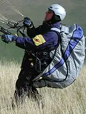 A pilot with harness (light blue), performing a reverse launch