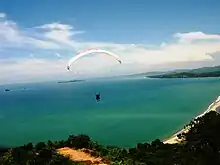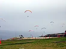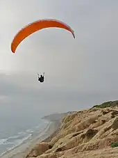 Paragliding is the recreational and competitive adventure sport of flying paragliders: lightweight, free-flying, foot-launched glider aircraft with no rigid primary structure.[1] The pilot sits in a harness or in a cocoon-like 'pod' suspended below a fabric wing. Wing shape is maintained by the suspension lines, the pressure of air entering vents in the front of the wing, and the aerodynamic forces of the air flowing over the outside.