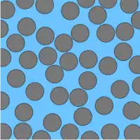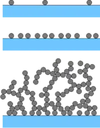 The blocking process has been studied in detail in terms of the random sequential adsorption (RSA) model.[4] The simplest RSA model related to deposition of spherical particles considers irreversible adsorption of circular disks. One disk after another is placed randomly at a surface. Once a disk is placed, it sticks at the same spot, and cannot be removed. When an attempt to deposit a disk would result in an overlap with an already deposited disk, this attempt is rejected. Within this model, the surface is initially filled rapidly, but the more one approaches saturation the slower the surface is being filled. Within the RSA model, saturation is referred to as jamming. For circular disks, jamming occurs at a coverage of 0.547. When the depositing particles are polydisperse, much higher surface coverage can be reached, since the small particles will be able to deposit into the holes in between the larger deposited particles. On the other hand, rod like particles may lead to much smaller coverage, since a few misaligned rods may block a large portion of the surface.