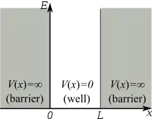The simplest form of the particle in a box model considers a one-dimensional system. Here, the particle may only move backwards and forwards along a straight line with impenetrable barriers at either end.[1] The walls of a one-dimensional box may be seen as regions of space with an infinitely large potential energy. Conversely, the interior of the box has a constant, zero potential energy.[2] This means that no forces act upon the particle inside the box and it can move freely in that region. However, infinitely large forces repel the particle if it touches the walls of the box, preventing it from escaping. The potential energy in this model is given as