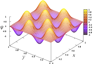 which is known as the dispersion relation for a free particle.[1] Here one must notice that now, since the particle is not entirely free but under the influence of a potential (the potential V described above), the energy of the particle given above is not the same thing as where p is the momentum of the particle, and thus the wavenumber k above actually describes the energy states of the particle, not the momentum states (i.e. it turns out that the momentum of the particle is not given by ). In this sense, it is quite dangerous to call the number k a wavenumber, since it is not related to momentum like "wavenumber" usually is. The rationale for calling k the wavenumber is that it enumerates the number of crests that the wavefunction has inside the box, and in this sense it is a wavenumber. This discrepancy can be seen more clearly below, when we find out that the energy spectrum of the particle is discrete (only discrete values of energy are allowed) but the momentum spectrum is continuous (momentum can vary continuously) and in particular, the relation for the energy and momentum of the particle does not hold. As said above, the reason this relation between energy and momentum does not hold is that the particle is not free, but there is a potential V in the system, and the energy of the particle is , where T is the kinetic and V the potential energy.