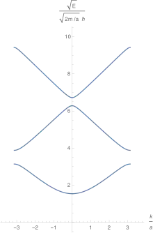 For a different and detailed calculation of the gap formula (i.e. for the gap between bands) and the level splitting of eigenvalues of the one-dimensional Schrödinger equation see Müller-Kirsten.[4] Corresponding results for the cosine potential (Mathieu equation) are also given in detail in this reference.