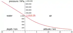 • Scuba divers must understand this principle. Starting from normal atmospheric pressure, about 100 kilopascal, the pressure increases by about 100 kPa for each increase of 10 m depth.[8]