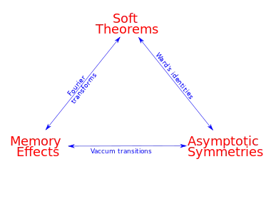 The connections are among weak and lasting effects caused by the passage of gravitational or electromagnetic waves (memory effects), quantum field theorems on graviton and photon and geometrical symmetries of spacetime. Because all of this occurs under conditions of low energy, known as infrared in the language of physicists, it is also referred to as the infrared triangle.[2]