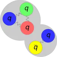 The quarks are bound together by the strong force, which acts in such a way as to cancel the colour charges within the particle. In a meson, this means a quark is partnered with an antiquark with an opposite colour charge – blue and antiblue, for example – while in a baryon, the three quarks have between them all three colour charges – red, blue, and green.[lower-alpha 2] In a pentaquark, the colours also need to cancel out, and the only feasible combination is to have one quark with one colour (e.g. red), one quark with a second colour (e.g. green), two quarks with the third colour (e.g. blue), and one antiquark to counteract the surplus colour (e.g. antiblue).[11]