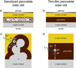 Perovskite solar cells function efficiently in a number of somewhat different architectures depending either on the role of the perovskite material in the device, or the nature of the top and bottom electrode. Devices in which positive charges are extracted by the transparent bottom electrode (cathode), can predominantly be divided into 'sensitized', where the perovskite functions mainly as a light absorber, and charge transport occurs in other materials, or 'thin-film', where most electron or hole transport occurs in the bulk of the perovskite itself. Similar to the sensitization in dye-sensitized solar cells, the perovskite material is coated onto a charge-conducting mesoporous scaffold – most commonly TiO2 – as light-absorber. The photogenerated electrons are transferred from the perovskite layer to the mesoporous sensitized layer through which they are transported to the electrode and extracted into the circuit. The thin film solar cell architecture is based on the finding that perovskite materials can also act as highly efficient, ambipolar charge-conductor.[100]