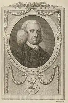 Although Collinson was a cloth merchant by vocation, largely trading with North America, his real love was gardening. Through his business contacts, he obtained samples of seeds and plants from around the world. Collinson's personal plant collections, first at Peckham and later at Mill Hill became famous. He came to realise that there was a market for such things in England and, in the late 1730s, began to import North American botanical seeds for English collectors to grow through financing the travels of John Bartram. Yearly, he distributed the New World seeds collected by Bartram to British gentry, nurserymen, and natural scientists including Dillenius, Philip Miller, Lord Petre, the Dukes of Richmond and Norfolk, James Gordon,[1] John Busch, etc. Collinson was also the patron of the artist and natural historian Mark Catesby. His presentation copy of Catesby's Natural History of Carolina, Florida and the Bahama Islands was passed down to his grandson Charles Streynsham Collinson (1753-1834) and was sold for £15 10s after his death[2]