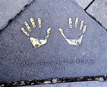 Higgs was presented with an engraved loving cup by the Rt Hon George Grubb, Lord Provost of Edinburgh, in a ceremony held at the City Chambers on Friday 24 February 2012. The event also marked the unveiling of his handprints in the City Chambers quadrangle, where they had been engraved in Caithness stone alongside those of previous Edinburgh Award recipients.[45][46][47]
