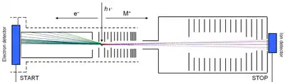 Photoelectron photoion coincidence spectroscopy (PEPICO) is a combination of photoionization mass spectrometry and photoelectron spectroscopy.[1] It is largely based on the photoelectric effect. Free molecules from a gas-phase sample are ionized by incident vacuum ultraviolet (VUV) radiation. In the ensuing photoionization, a cation and a photoelectron are formed for each sample molecule. The mass of the photoion is determined by time-of-flight mass spectrometry, whereas, in current setups, photoelectrons are typically detected by velocity map imaging. Electron times-of-flight are three orders of magnitude smaller than those of ions, which allows electron detection to be used as a time stamp for the ionization event, starting the clock for the ion time-of-flight analysis. In contrast with pulsed experiments, such as REMPI, in which the light pulse must act as the time stamp, this allows to use continuous light sources, e.g. a discharge lamp or a synchrotron light source. No more than several ion–electron pairs are present simultaneously in the instrument, and the electron–ion pairs belonging to a single photoionization event can be identified and detected in delayed coincidence.