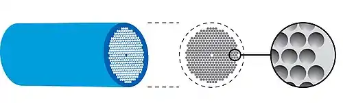 Diagram of a photonic crystal fiber in perspective and cross-sectional views. A solid-core fiber is shown with a periodic air hole cladding and a solid blue coating.