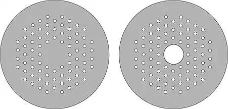 Diagram in cross-sectional view of two types of photonic crystal fibers: index guide (left) and photonic bandgap (right).