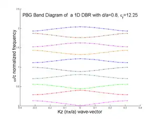 The plane wave expansion method can be used to calculate the band structure using an eigen formulation of the Maxwell's equations, and thus solving for the eigen frequencies for each of the propagation directions, of the wave vectors. It directly solves for the dispersion diagram. Electric field strength values can also be calculated over the spatial domain of the problem using the eigen vectors of the same problem. For the picture shown to the right, corresponds to the band-structure of a 1D distributed Bragg reflector (DBR) with air-core interleaved with a dielectric material of relative permittivity 12.25, and a lattice period to air-core thickness ratio (d/a) of 0.8, is solved using 101 planewaves over the first irreducible Brillouin zone. The Inverse dispersion method also exploited plane wave expansion but formulates Maxwell's equation as an eigenproblem for the wave vector k while the frequency is considered as a parameter.[63] Thus, it solves the dispersion relation instead of , which plane wave method does. The inverse dispersion method makes it possible to find complex value of the wave vector e.g. in the bandgap, which allows one to distinguish photonic crystals from metamaterial. Besides, the method is ready for the frequency dispersion of the permittivity to be taken into account.