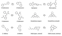 A photochromic compound can change its configuration or structure upon irradiation with light. Several examples of photochromic compounds include: azobenzene,[6] spiropyran,[7] merocyanine,[8] diarylethene,[9] spirooxazine,[10] fulgide,[11] hydrazone,[12] nobormadiene,[13] thioindigo,[14] acrylamide-azobenzene-quaternary ammonia,[15] donor-acceptor Stenhouse adducts,[16][17] stilbene,[18] etc.