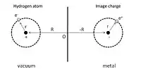 The first term is the attractive interaction of nucleus and its image charge, and the second term is due to the interaction of the electron and its image charge. The repulsive interaction is shown in the third and fourth terms arising from the interaction between the nucleus and the image electron, and, the interaction between the electron and the image nucleus, respectively.