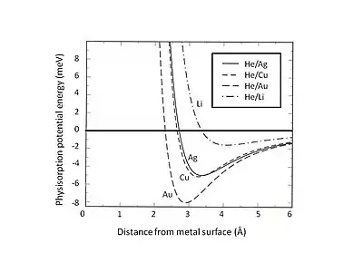 This Pauli exclusion and repulsion are particularly strong for atoms with closed valence shells that dominate the surface interaction. As a result, the minimum energy of physisorption must be found by the balance between the long-range van der Waals attraction and short-range Pauli repulsion. For instance, by separating the total interaction of physisorption into two contributions—a short-range term depicted by Hartree–Fock theory and a long-range van der Waals attraction—the equilibrium position of physisorption for rare gases adsorbed on jellium substrate can be determined.[5] Fig. 2 shows the physisorption potential energy of He adsorbed on Ag, Cu, and Au substrates which are described by the jellium model with different densities of smear-out background positive charges. It can be found that the weak van der Waals interaction leads to shallow attractive energy wells (<10 meV). One of the experimental methods for exploring physisorption potential energy is the scattering process, for instance, inert gas atoms scattered from metal surfaces. Certain specific features of the interaction potential between scattered atoms and surface can be extracted by analyzing the experimentally determined angular distribution and cross sections of the scattered particles.