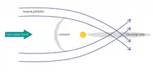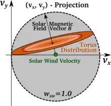 In solar physics, heliospheric pickup ions are created when neutral particles inside the heliosphere are ionized by either solar ultraviolet radiation, charge exchange with solar wind protons or electron impact ionization. Pickup ions are generally characterized by their single charge state, a typical velocity that ranges between 0 km/s and twice the solar wind velocity (~800 km/s), a composition that reflects their neutral seed population and their spatial distribution in the heliosphere. The neutral seed population of these ions can either be of interstellar origin or of lunar-, cometary, or inner-source origin.[2] Just after the ionization, the singly charged ions are picked up by the magnetized solar wind plasma and develop strong anisotropic and toroidal velocity distribution functions, which gradually transform into a more isotropic state.[1] After their creation, pickup ions move with the solar wind radially outwards from the Sun.