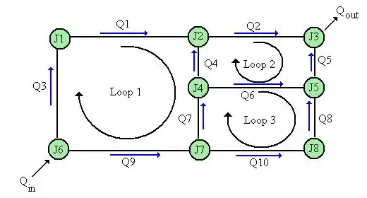 The modern method is simply to create a set of conditions from the above Kirchhoff laws (junctions and head-loss criteria). Then, use a Root-finding algorithm to find Q values that satisfy all the equations. The literal friction loss equations use a term called Q2, but we want to preserve any changes in direction. Create a separate equation for each loop where the head losses are added up, but instead of squaring Q, use |QQ instead (with |Q| the absolute value of Q) for the formulation so that any sign changes reflect appropriately in the resulting head-loss calculation.